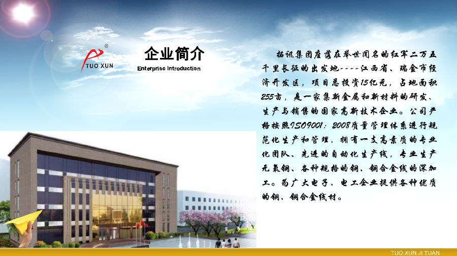 拓讯集团于2012年落户瑞金市,位于瑞金市经济技术开发区创业大道西侧,,项目总投资15亿元,占地255亩,属新材料领域的金属材料企业。集团主营产品为铜、铝加工、铜铝合金导体、稀土铝合金电缆、电线电缆绝缘材料、变压器、电子电线接插件、光缆、通讯线缆、特种电缆、高温电缆等,目前具有年产10亿元的能力。公司为华为、中兴等著名厂家的二级供应商,公司拥有发明专利、实用型发明专利35项。公司荣获江西省科技型中小微企业,国家级高新技术企业的称号。